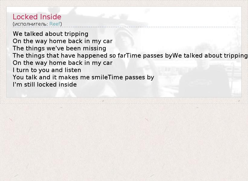 We talked about tripping On the way home back in my car The things we've been missing The things that have happened so farTime passes byWe talked about tripping On the way home back in my car I turn to you and listen You talk and it makes me smileTime passes by I'm still locked inside