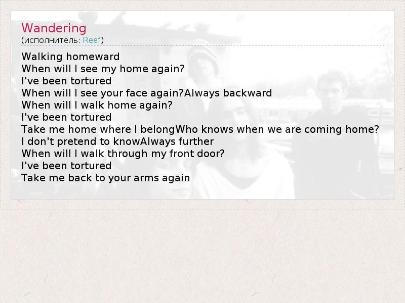 Walking homeward When will I see my home again? I've been tortured When will I see your face again?Always backward When will I walk home again? I've been tortured Take me home where I belongWho knows when we are coming home? I don't pretend to knowAlways further When will I walk through my front door? I've been tortured Take me back to your arms again