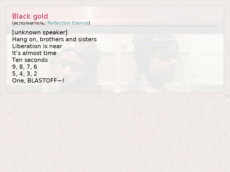 Это интересно:Дуэт, состоящий из Talib Kweli (35 лет) и Hi Tek (34 года) и который также известен как Reflection Eternal, не принадлежит к категории тех рэп-коллективов, которым дают определение "группа на один сезон". Они пришли в хип-хоп надолго и заняли твердую позицию качественного и перспективного уличного рэпа…История образования дуэта берет начало в 1994 году, когда молодой выходец из Бруклина Talib Kweli посетил... продолжение