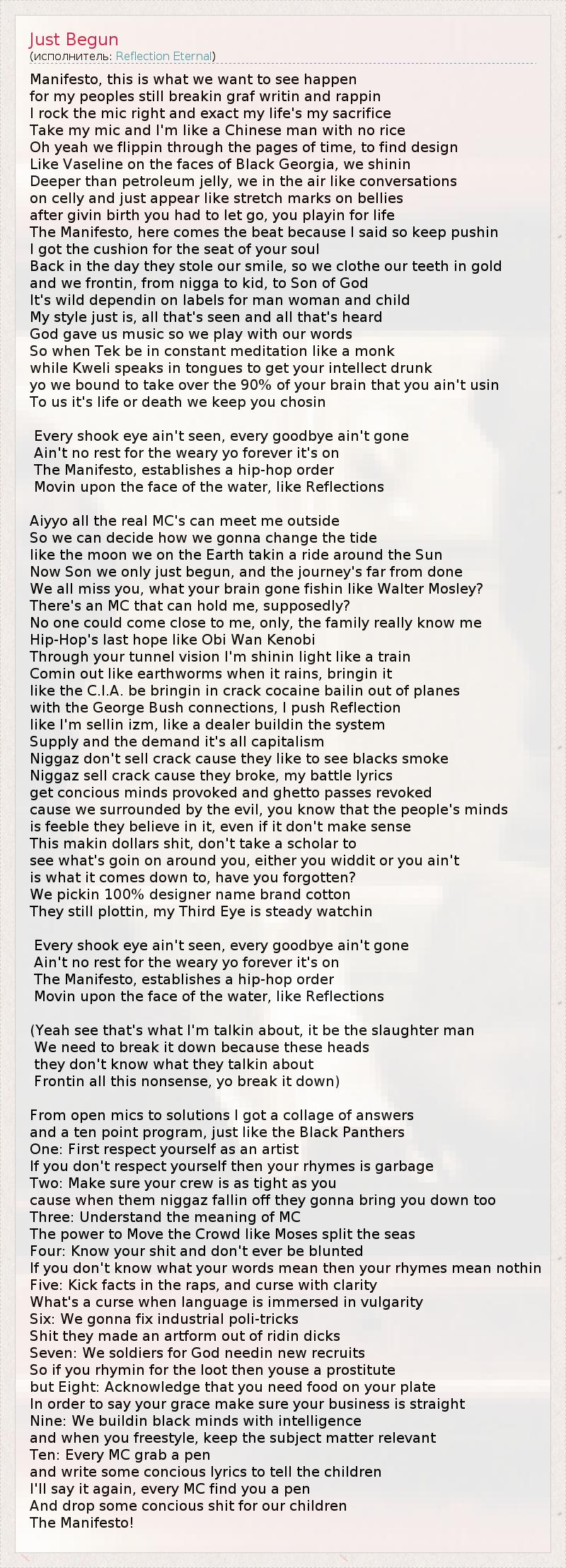 Manifesto, this is what we want to see happen for my peoples still breakin graf writin and rappin I rock the mic right and exact my life's my sacrifice Take my mic and I'm like a Chinese man with no rice Oh yeah we flippin through the pages of time, to find design Like Vaseline on the faces of Black Georgia, we shinin Deeper than petroleum jelly, we in the air like conversations on celly and just appear like stretch marks on bellies after givin birth you had to let go, you playin for life The Manifesto, here comes the beat because I said so keep pushin I got the cushion for the seat of your soul Back in the day they stole our smile, so we clothe our teeth in gold and we frontin, from nigga to kid, to Son of God It's wild dependin on labels for man woman and child My style just is, all that's seen and all that's heard God gave us music so we play with our words So when Tek be in constant meditation like a monk while Kweli speaks in tongues to get your intellect drunk yo we bound to take over the 90% of your brain that you ain't usin To us it's life or death we keep you chosin Every shook eye ain't seen, every goodbye ain't gone Ain't no rest for the weary yo forever it's on The Manifesto, establishes a hip-hop order Movin upon the face of the water, like Reflections Aiyyo all the real MC's can meet me outside So we can decide how we gonna change the tide like the moon we on the Earth takin a ride around the Sun Now Son we only just begun, and the journey's far from done We all miss you, what your brain gone fishin like Walter Mosley? There's an MC that can hold me, supposedly? No one could come close to me, only, the family really know me Hip-Hop's last hope like Obi Wan Kenobi Through your tunnel vision I'm shinin light like a train Comin out like earthworms when it rains, bringin it like the C.I.A. be bringin in crack cocaine bailin out of planes with the George Bush connections, I push Reflection like I'm sellin izm, like a dealer buildin the system Supply and the demand it's all capitalism Niggaz don't sell crack cause they like to see blacks smoke Niggaz sell crack cause they broke, my battle lyrics get concious minds provoked and ghetto passes revoked cause we surrounded by the evil, you know that the people's minds is feeble they believe in it, even if it don't make sense This makin dollars shit, don't take a scholar to see what's goin on around you, either you widdit or you ain't is what it comes down to, have you forgotten? We pickin 100% designer name brand cotton They still plottin, my Third Eye is steady watchin Every shook eye ain't seen, every goodbye ain't gone Ain't no rest for the weary yo forever it's on The Manifesto, establishes a hip-hop order Movin upon the face of the water, like Reflections (Yeah see that's what I'm talkin about, it be the slaughter man We need to break it down because these heads they don't know what they talkin about Frontin all this nonsense, yo break it down) From open mics to solutions I got a collage of answers and a ten point program, just like the Black Panthers One: First respect yourself as an artist If you don't respect yourself then your rhymes is garbage Two: Make sure your crew is as tight as you cause when them niggaz fallin off they gonna bring you down too Three: Understand the meaning of MC The power to Move the Crowd like Moses split the seas Four: Know your shit and don't ever be blunted If you don't know what your words mean then your rhymes mean nothin Five: Kick facts in the raps, and curse with clarity What's a curse when language is immersed in vulgarity Six: We gonna fix industrial poli-tricks Shit they made an artform out of ridin dicks Seven: We soldiers for God needin new recruits So if you rhymin for the loot then youse a prostitute but Eight: Acknowledge that you need food on your plate In order to say your grace make sure your business is straight Nine: We buildin black minds with intelligence and when you freestyle, keep the subject matter relevant Ten: Every MC grab a pen and write some concious lyrics to tell the children I'll say it again, every MC find you a pen And drop some concious shit for our children The Manifesto!