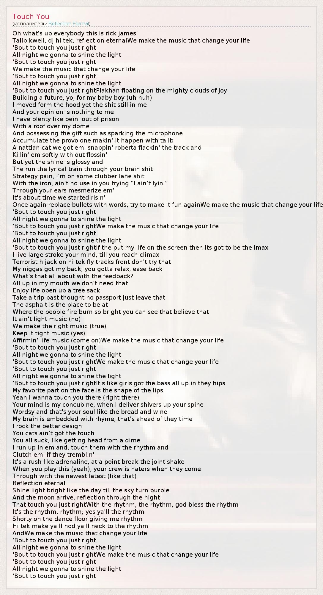 Это интересно:Дуэт, состоящий из Talib Kweli (35 лет) и Hi Tek (34 года) и который также известен как Reflection Eternal, не принадлежит к категории тех рэп-коллективов, которым дают определение "группа на один сезон". Они пришли в хип-хоп надолго и заняли твердую позицию качественного и перспективного уличного рэпа…История образования дуэта берет начало в 1994 году, когда молодой выходец из Бруклина Talib Kweli посетил... продолжение