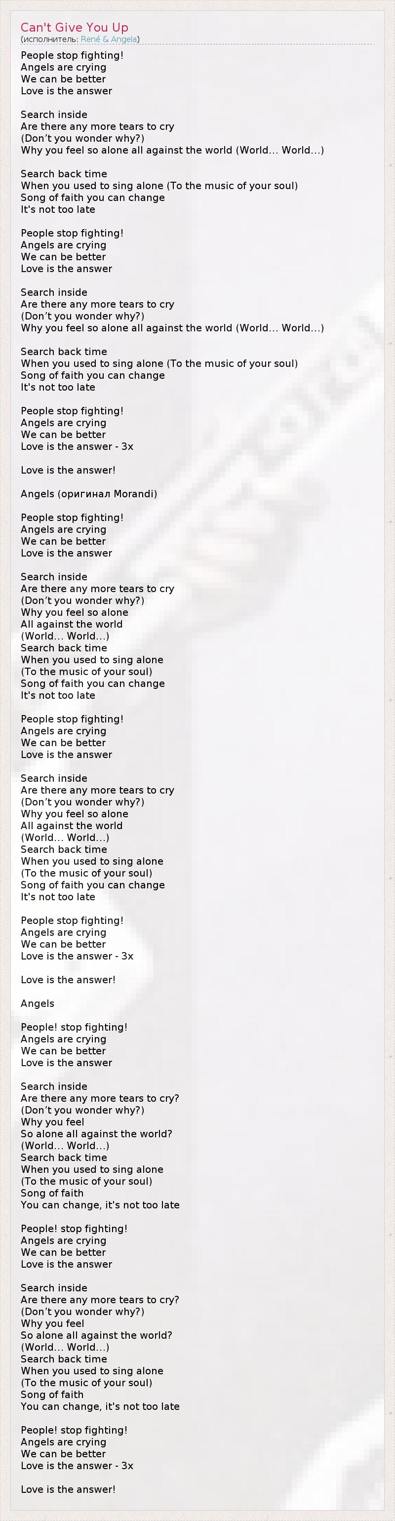 People stop fighting! Angels are crying We can be better Love is the answer Search inside Are there any more tears to cry (Don’t you wonder why?) Why you feel so alone all against the world (World… World…) Search back time When you used to sing alone (To the music of your soul) Song of faith you can change It's not too late People stop fighting! Angels are crying We can be better Love is the answer Search inside Are there any more tears to cry (Don’t you wonder why?) Why you feel so alone all against the world (World… World…) Search back time When you used to sing alone (To the music of your soul) Song of faith you can change It's not too late People stop fighting! Angels are crying We can be better Love is the answer - 3х Love is the answer! Angels (оригинал Morandi) People stop fighting! Angels are crying We can be better Love is the answer Search inside Are there any more tears to cry (Don’t you wonder why?) Why you feel so alone All against the world (World… World…) Search back time When you used to sing alone (To the music of your soul) Song of faith you can change It's not too late People stop fighting! Angels are crying We can be better Love is the answer Search inside Are there any more tears to cry (Don’t you wonder why?) Why you feel so alone All against the world (World… World…) Search back time When you used to sing alone (To the music of your soul) Song of faith you can change It's not too late People stop fighting! Angels are crying We can be better Love is the answer - 3х Love is the answer! Angels People! stop fighting! Angels are crying We can be better Love is the answer Search inside Are there any more tears to cry? (Don’t you wonder why?) Why you feel So alone all against the world? (World… World…) Search back time When you used to sing alone (To the music of your soul) Song of faith You can change, it's not too late People! stop fighting! Angels are crying We can be better Love is the answer Search inside Are there any more tears to cry? (Don’t you wonder why?) Why you feel So alone all against the world? (World… World…) Search back time When you used to sing alone (To the music of your soul) Song of faith You can change, it's not too late People! stop fighting! Angels are crying We can be better Love is the answer - 3х Love is the answer!