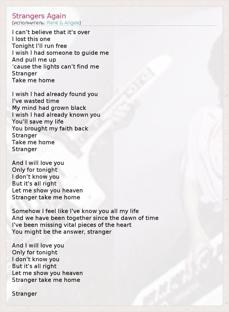 I can't believe that it's over I lost this one Tonight I'll run free I wish I had someone to guide me And pull me up ‘cause the lights can't find me Stranger Take me home I wish I had already found you I've wasted time My mind had grown black I wish I had already known you You'll save my life You brought my faith back Stranger Take me home Stranger And I will love you Only for tonight I don't know you But it's all right Let me show you heaven Stranger take me home Somehow I feel like I've know you all my life And we have been together since the dawn of time I've been missing vital pieces of the heart You might be the answer, stranger And I will love you Only for tonight I don't know you But it's all right Let me show you heaven Stranger take me home Stranger