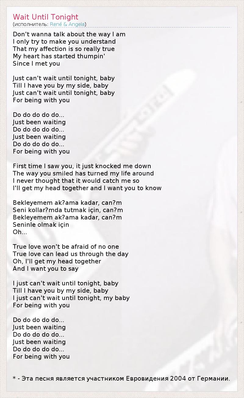 Don't wanna talk about the way I am I only try to make you understand That my affection is so really true My heart has started thumpin' Since I met you Just can't wait until tonight, baby Till I have you by my side, baby Just can't wait until tonight, baby For being with you Do do do do do... Just been waiting Do do do do do... Just been waiting Do do do do do... For being with you First time I saw you, it just knocked me down The way you smiled has turned my life around I never thought that it would catch me so I'll get my head together and I want you to know Bekleyemem ak?ama kadar, can?m Seni kollar?mda tutmak için, can?m Bekleyemem ak?ama kadar, can?m Seninle olmak için Oh... True love won't be afraid of no one True love can lead us through the day Oh, I'll get my head together And I want you to say I just can't wait until tonight, baby Till I have you by my side, baby I just can't wait until tonight, my baby For being with you Do do do do do... Just been waiting Do do do do do... Just been waiting Do do do do do... For being with you * - Эта песня является участником Евровидения 2004 от Германии.
