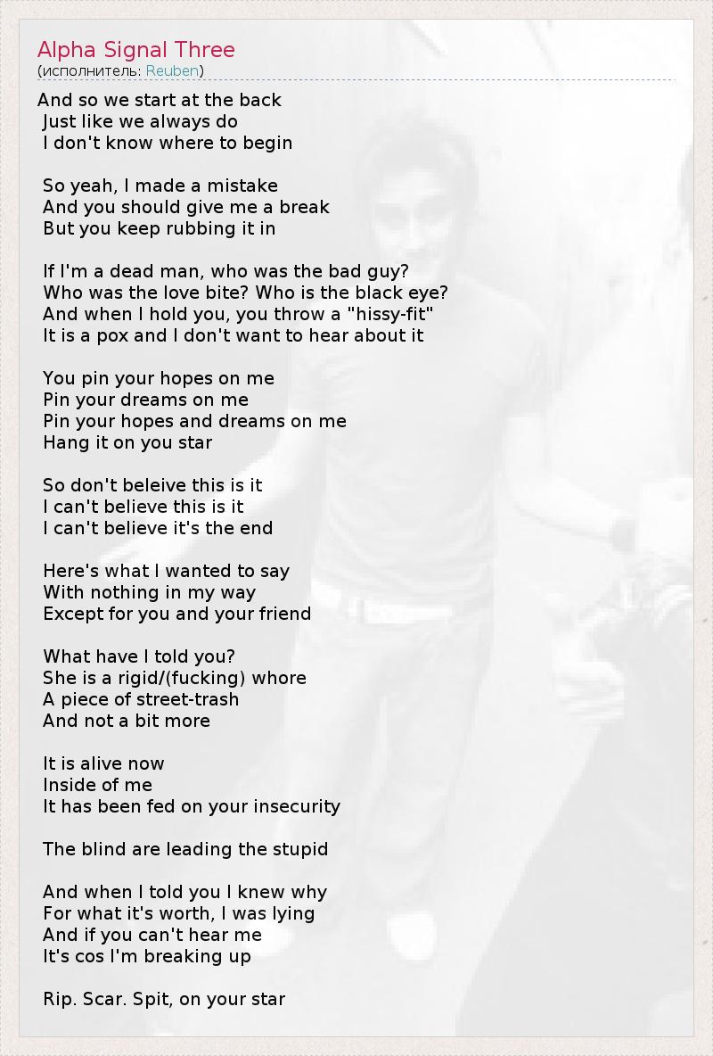 And so we start at the back Just like we always do I don't know where to begin So yeah, I made a mistake And you should give me a break But you keep rubbing it in If I'm a dead man, who was the bad guy? Who was the love bite? Who is the black eye? And when I hold you, you throw a "hissy-fit" It is a pox and I don't want to hear about it You pin your hopes on me Pin your dreams on me Pin your hopes and dreams on me Hang it on you star So don't beleive this is it I can't believe this is it I can't believe it's the end Here's what I wanted to say With nothing in my way Except for you and your friend What have I told you? She is a rigid/(fucking) whore A piece of street-trash And not a bit more It is alive now Inside of me It has been fed on your insecurity The blind are leading the stupid And when I told you I knew why For what it's worth, I was lying And if you can't hear me It's cos I'm breaking up Rip. Scar. Spit, on your star