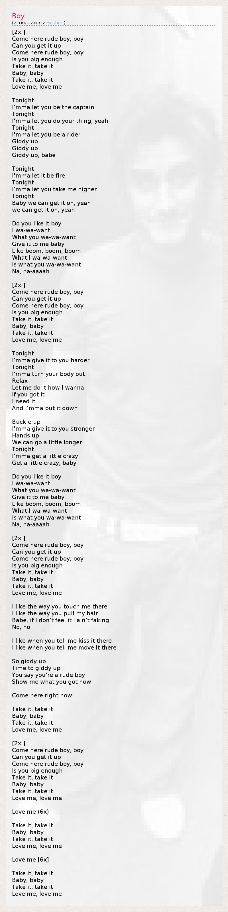 [2x:] Come here rude boy, boy Can you get it up Come here rude boy, boy Is you big enough Take it, take it Baby, baby Take it, take it Love me, love me Tonight I'mma let you be the captain Tonight I'mma let you do your thing, yeah Tonight I'mma let you be a rider Giddy up Giddy up Giddy up, babe Tonight I'mma let it be fire Tonight I'mma let you take me higher Tonight Baby we can get it on, yeah we can get it on, yeah Do you like it boy I wa-wa-want What you wa-wa-want Give it to me baby Like boom, boom, boom What I wa-wa-want Is what you wa-wa-want Na, na-aaaah [2x:] Come here rude boy, boy Can you get it up Come here rude boy, boy Is you big enough Take it, take it Baby, baby Take it, take it Love me, love me Tonight I'mma give it to you harder Tonight I'mma turn your body out Relax Let me do it how I wanna If you got it I need it And I'mma put it down Buckle up I'mma give it to you stronger Hands up We can go a little longer Tonight I'mma get a little crazy Get a little crazy, baby Do you like it boy I wa-wa-want What you wa-wa-want Give it to me baby Like boom, boom, boom What I wa-wa-want Is what you wa-wa-want Na, na-aaaah [2x:] Come here rude boy, boy Can you get it up Come here rude boy, boy Is you big enough Take it, take it Baby, baby Take it, take it Love me, love me I like the way you touch me there I like the way you pull my hair Babe, if I don't feel it I ain't faking No, no I like when you tell me kiss it there I like when you tell me move it there So giddy up Time to giddy up You say you're a rude boy Show me what you got now Come here right now Take it, take it Baby, baby Take it, take it Love me, love me [2x:] Come here rude boy, boy Can you get it up Come here rude boy, boy Is you big enough Take it, take it Baby, baby Take it, take it Love me, love me Love me (6x) Take it, take it Baby, baby Take it, take it Love me, love me Love me [6x] Take it, take it Baby, baby Take it, take it Love me, love me