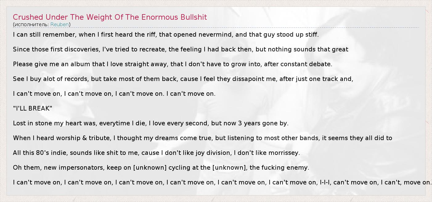 А как ты думаешь, о чем песня "Crushed Under The Weight Of The Enormous Bullshit" ?