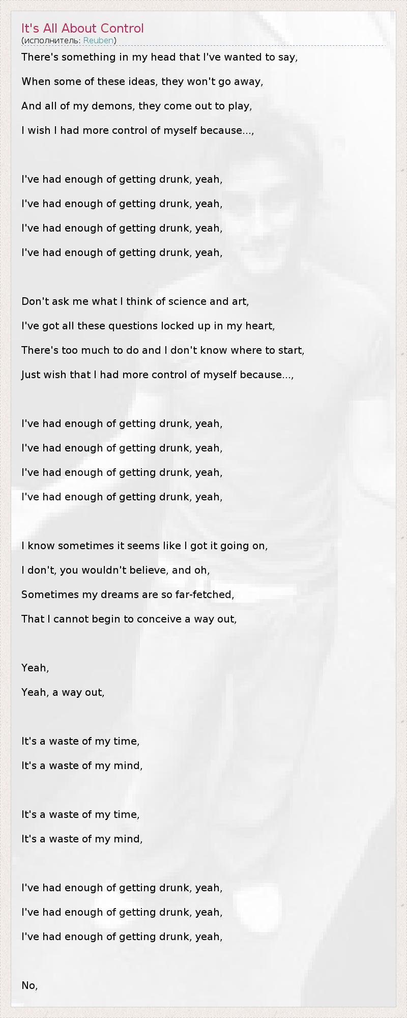 There's something in my head that I've wanted to say, When some of these ideas, they won't go away, And all of my demons, they come out to play, I wish I had more control of myself because..., I've had enough of getting drunk, yeah, I've had enough of getting drunk, yeah, I've had enough of getting drunk, yeah, I've had enough of getting drunk, yeah, Don't ask me what I think of science and art, I've got all these questions locked up in my heart, There's too much to do and I don't know where to start, Just wish that I had more control of myself because..., I've had enough of getting drunk, yeah, I've had enough of getting drunk, yeah, I've had enough of getting drunk, yeah, I've had enough of getting drunk, yeah, I know sometimes it seems like I got it going on, I don't, you wouldn't believe, and oh, Sometimes my dreams are so far-fetched, That I cannot begin to conceive a way out, Yeah, Yeah, a way out, It's a waste of my time, It's a waste of my mind, It's a waste of my time, It's a waste of my mind, I've had enough of getting drunk, yeah, I've had enough of getting drunk, yeah, I've had enough of getting drunk, yeah, No,