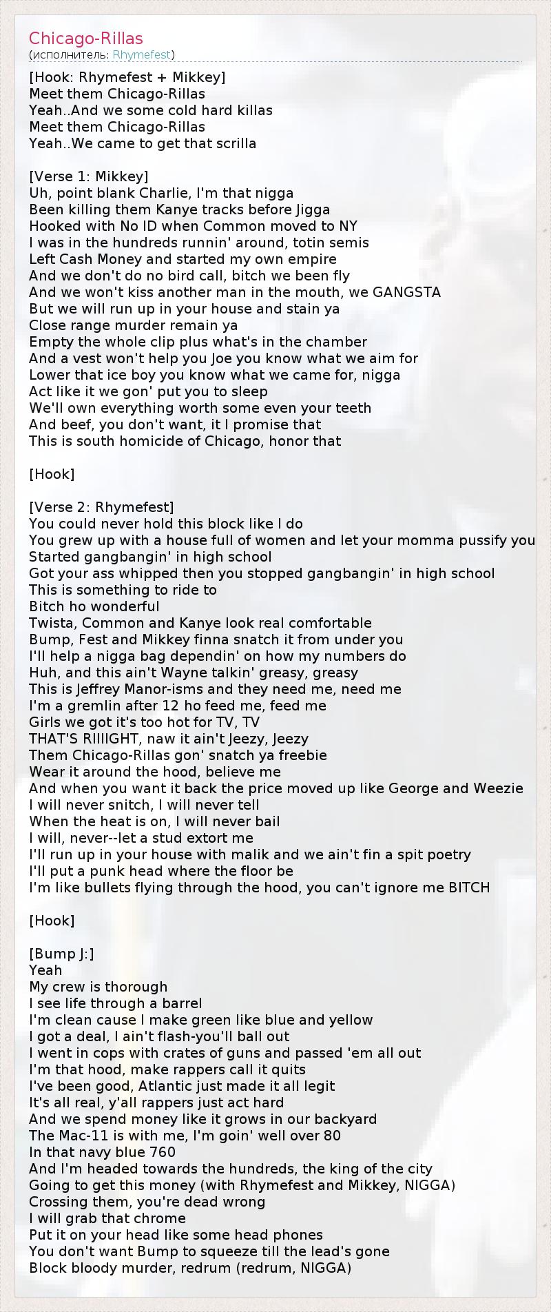 [Hook: Rhymefest + Mikkey] Meet them Chicago-Rillas Yeah..And we some cold hard killas Meet them Chicago-Rillas Yeah..We came to get that scrilla [Verse 1: Mikkey] Uh, point blank Charlie, I'm that nigga Been killing them Kanye tracks before Jigga Hooked with No ID when Common moved to NY I was in the hundreds runnin' around, totin semis Left Cash Money and started my own empire And we don't do no bird call, bitch we been fly And we won't kiss another man in the mouth, we GANGSTA But we will run up in your house and stain ya Close range murder remain ya Empty the whole clip plus what's in the chamber And a vest won't help you Joe you know what we aim for Lower that ice boy you know what we came for, nigga Act like it we gon' put you to sleep We'll own everything worth some even your teeth And beef, you don't want, it I promise that This is south homicide of Chicago, honor that [Hook] [Verse 2: Rhymefest] You could never hold this block like I do You grew up with a house full of women and let your momma pussify you Started gangbangin' in high school Got your ass whipped then you stopped gangbangin' in high school This is something to ride to Bitch ho wonderful Twista, Common and Kanye look real comfortable Bump, Fest and Mikkey finna snatch it from under you I'll help a nigga bag dependin' on how my numbers do Huh, and this ain't Wayne talkin' greasy, greasy This is Jeffrey Manor-isms and they need me, need me I'm a gremlin after 12 ho feed me, feed me Girls we got it's too hot for TV, TV THAT'S RIIIIGHT, naw it ain't Jeezy, Jeezy Them Chicago-Rillas gon' snatch ya freebie Wear it around the hood, believe me And when you want it back the price moved up like George and Weezie I will never snitch, I will never tell When the heat is on, I will never bail I will, never--let a stud extort me I'll run up in your house with malik and we ain't fin a spit poetry I'll put a punk head where the floor be I'm like bullets flying through the hood, you can't ignore me BITCH [Hook] [Bump J:] Yeah My crew is thorough I see life through a barrel I'm clean cause I make green like blue and yellow I got a deal, I ain't flash-you'll ball out I went in cops with crates of guns and passed 'em all out I'm that hood, make rappers call it quits I've been good, Atlantic just made it all legit It's all real, y'all rappers just act hard And we spend money like it grows in our backyard The Mac-11 is with me, I'm goin' well over 80 In that navy blue 760 And I'm headed towards the hundreds, the king of the city Going to get this money (with Rhymefest and Mikkey, NIGGA) Crossing them, you're dead wrong I will grab that chrome Put it on your head like some head phones You don't want Bump to squeeze till the lead's gone Block bloody murder, redrum (redrum, NIGGA)