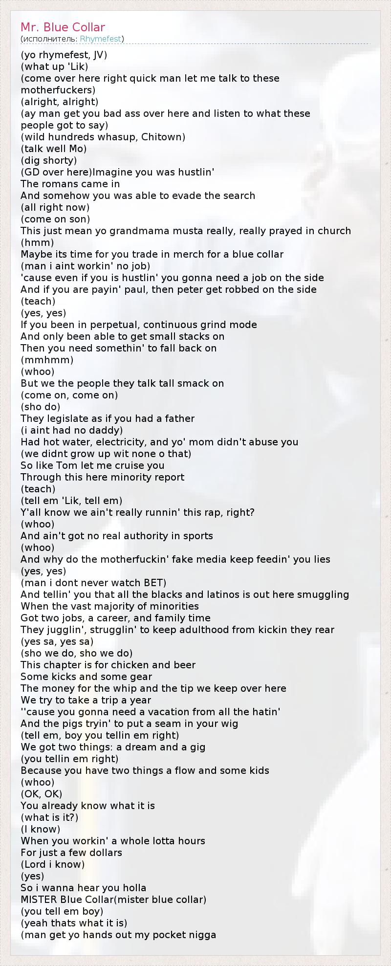 (yo rhymefest, JV) (what up 'Lik) (come over here right quick man let me talk to these motherfuckers) (alright, alright) (ay man get you bad ass over here and listen to what these people got to say) (wild hundreds whasup, Chitown) (talk well Mo) (dig shorty) (GD over here)Imagine you was hustlin' The romans came in And somehow you was able to evade the search (all right now) (come on son) This just mean yo grandmama musta really, really prayed in church (hmm) Maybe its time for you trade in merch for a blue collar (man i aint workin' no job) 'cause even if you is hustlin' you gonna need a job on the side And if you are payin' paul, then peter get robbed on the side (teach) (yes, yes) If you been in perpetual, continuous grind mode And only been able to get small stacks on Then you need somethin' to fall back on (mmhmm) (whoo) But we the people they talk tall smack on (come on, come on) (sho do) They legislate as if you had a father (i aint had no daddy) Had hot water, electricity, and yo' mom didn't abuse you (we didnt grow up wit none o that) So like Tom let me cruise you Through this here minority report (teach) (tell em 'Lik, tell em) Y'all know we ain't really runnin' this rap, right? (whoo) And ain't got no real authority in sports (whoo) And why do the motherfuckin' fake media keep feedin' you lies (yes, yes) (man i dont never watch BET) And tellin' you that all the blacks and latinos is out here smuggling When the vast majority of minorities Got two jobs, a career, and family time They jugglin', strugglin' to keep adulthood from kickin they rear (yes sa, yes sa) (sho we do, sho we do) This chapter is for chicken and beer Some kicks and some gear The money for the whip and the tip we keep over here We try to take a trip a year ''cause you gonna need a vacation from all the hatin' And the pigs tryin' to put a seam in your wig (tell em, boy you tellin em right) We got two things: a dream and a gig (you tellin em right) Because you have two things a flow and some kids (whoo) (OK, OK) You already know what it is (what is it?) (I know) When you workin' a whole lotta hours For just a few dollars (Lord i know) (yes) So i wanna hear you holla MISTER Blue Collar(mister blue collar) (you tell em boy) (yeah thats what it is) (man get yo hands out my pocket nigga