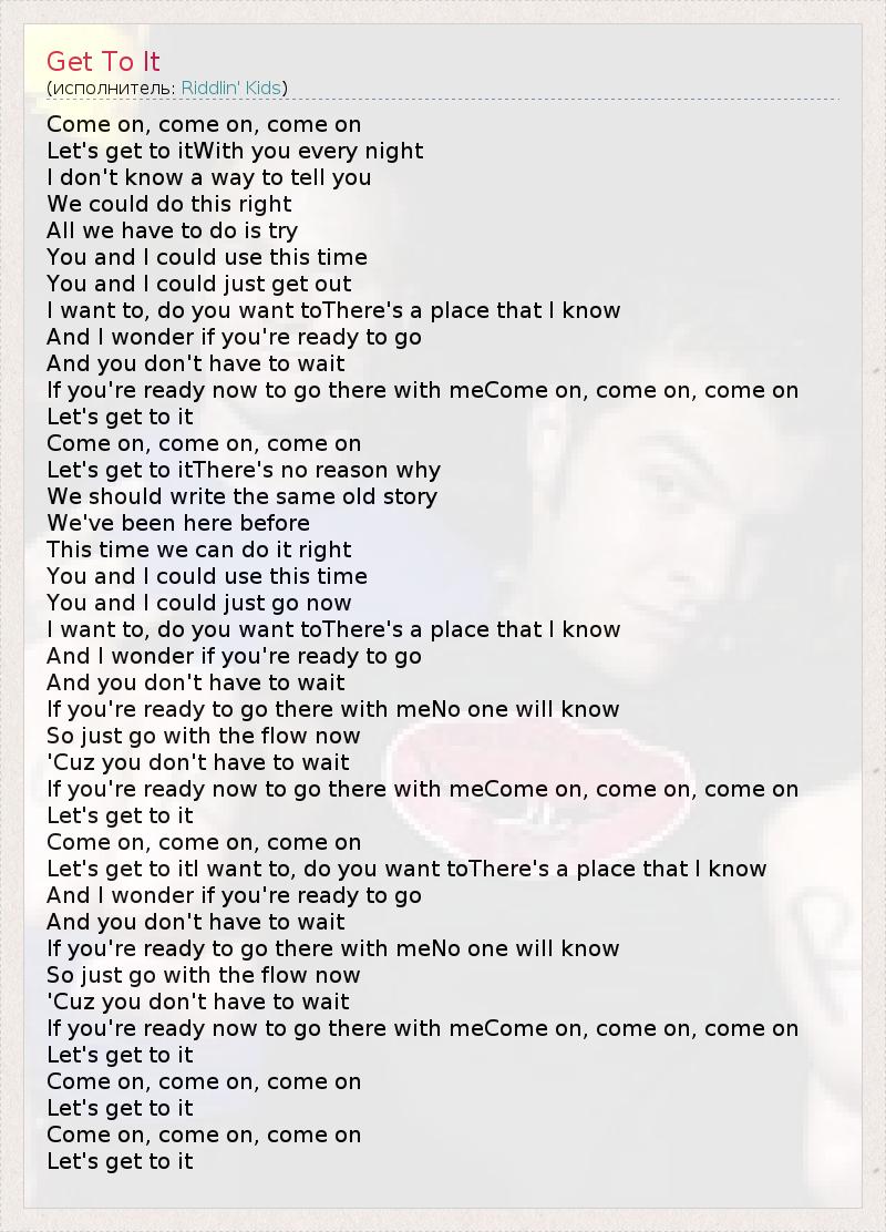 Come on, come on, come on Let's get to itWith you every night I don't know a way to tell you We could do this right All we have to do is try You and I could use this time You and I could just get out I want to, do you want toThere's a place that I know And I wonder if you're ready to go And you don't have to wait If you're ready now to go there with meCome on, come on, come on Let's get to it Come on, come on, come on Let's get to itThere's no reason why We should write the same old story We've been here before This time we can do it right You and I could use this time You and I could just go now I want to, do you want toThere's a place that I know And I wonder if you're ready to go And you don't have to wait If you're ready to go there with meNo one will know So just go with the flow now 'Cuz you don't have to wait If you're ready now to go there with meCome on, come on, come on Let's get to it Come on, come on, come on Let's get to itI want to, do you want toThere's a place that I know And I wonder if you're ready to go And you don't have to wait If you're ready to go there with meNo one will know So just go with the flow now 'Cuz you don't have to wait If you're ready now to go there with meCome on, come on, come on Let's get to it Come on, come on, come on Let's get to it Come on, come on, come on Let's get to it