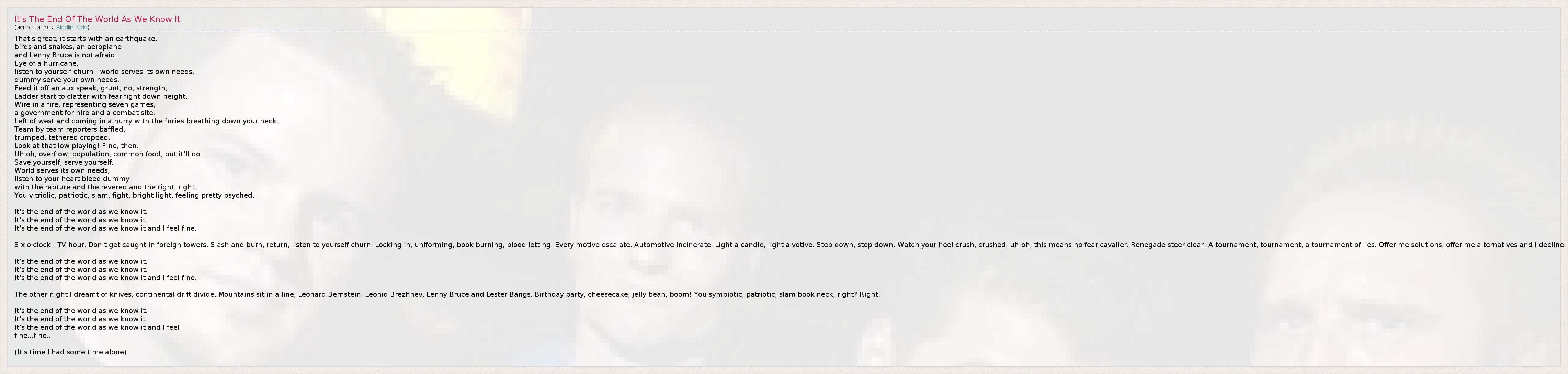 That's great, it starts with an earthquake, birds and snakes, an aeroplane and Lenny Bruce is not afraid. Eye of a hurricane, listen to yourself churn - world serves its own needs, dummy serve your own needs. Feed it off an aux speak, grunt, no, strength, Ladder start to clatter with fear fight down height. Wire in a fire, representing seven games, a government for hire and a combat site. Left of west and coming in a hurry with the furies breathing down your neck. Team by team reporters baffled, trumped, tethered cropped. Look at that low playing! Fine, then. Uh oh, overflow, population, common food, but it'll do. Save yourself, serve yourself. World serves its own needs, listen to your heart bleed dummy with the rapture and the revered and the right, right. You vitriolic, patriotic, slam, fight, bright light, feeling pretty psyched. It's the end of the world as we know it. It's the end of the world as we know it. It's the end of the world as we know it and I feel fine. Six o'clock - TV hour. Don't get caught in foreign towers. Slash and burn, return, listen to yourself churn. Locking in, uniforming, book burning, blood letting. Every motive escalate. Automotive incinerate. Light a candle, light a votive. Step down, step down. Watch your heel crush, crushed, uh-oh, this means no fear cavalier. Renegade steer clear! A tournament, tournament, a tournament of lies. Offer me solutions, offer me alternatives and I decline. It's the end of the world as we know it. It's the end of the world as we know it. It's the end of the world as we know it and I feel fine. The other night I dreamt of knives, continental drift divide. Mountains sit in a line, Leonard Bernstein. Leonid Brezhnev, Lenny Bruce and Lester Bangs. Birthday party, cheesecake, jelly bean, boom! You symbiotic, patriotic, slam book neck, right? Right. It's the end of the world as we know it. It's the end of the world as we know it. It's the end of the world as we know it and I feel fine...fine... (It's time I had some time alone)
