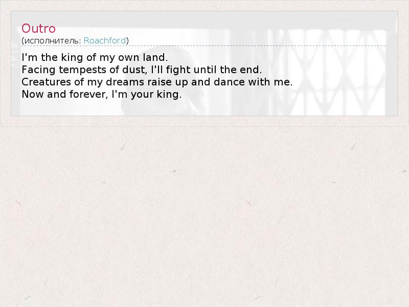 Я король на своей земле. И если встречусь с пыльной бурей, я буду сражаться до конца. Создания из моих снов восстают и танцуют со мной. Сейчас и навеки, я твой король.