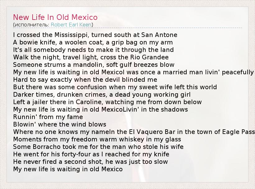А как ты думаешь, о чем песня "New Life In Old Mexico" ?