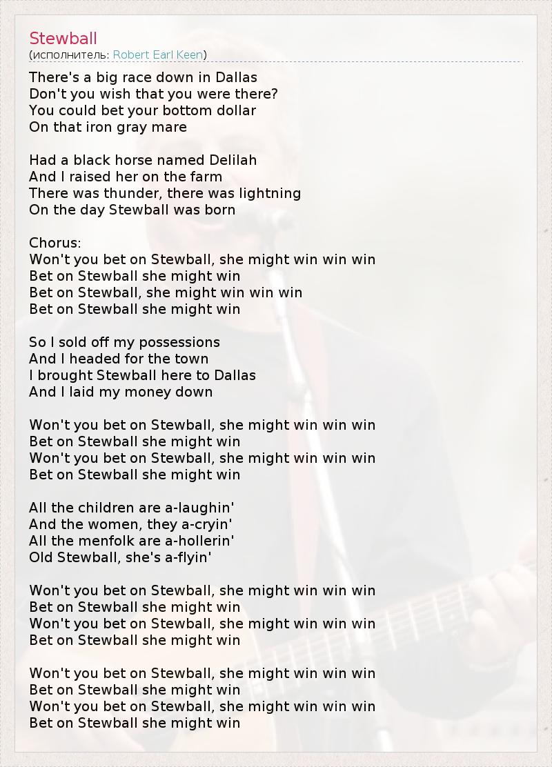 There's a big race down in Dallas Don't you wish that you were there? You could bet your bottom dollar On that iron gray mare Had a black horse named Delilah And I raised her on the farm There was thunder, there was lightning On the day Stewball was born Chorus: Won't you bet on Stewball, she might win win win Bet on Stewball she might win Bet on Stewball, she might win win win Bet on Stewball she might win So I sold off my possessions And I headed for the town I brought Stewball here to Dallas And I laid my money down Won't you bet on Stewball, she might win win win Bet on Stewball she might win Won't you bet on Stewball, she might win win win Bet on Stewball she might win All the children are a-laughin' And the women, they a-cryin' All the menfolk are a-hollerin' Old Stewball, she's a-flyin' Won't you bet on Stewball, she might win win win Bet on Stewball she might win Won't you bet on Stewball, she might win win win Bet on Stewball she might win Won't you bet on Stewball, she might win win win Bet on Stewball she might win Won't you bet on Stewball, she might win win win Bet on Stewball she might win