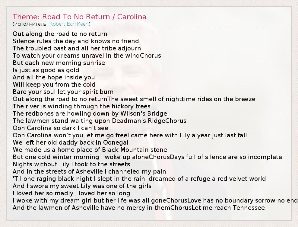 Out along the road to no return Silence rules the day and knows no friend The troubled past and all her tribe adjourn To watch your dreams unravel in the windChorus But each new morning sunrise Is just as good as gold And all the hope inside you Will keep you from the cold Bare your soul let your spirit burn Out along the road to no returnThe sweet smell of nighttime rides on the breeze The river is winding through the hickory trees The redbones are howling down by Wilson's Bridge The lawmen stand waiting upon Deadman's RidgeChorus Ooh Carolina so dark I can't see Ooh Carolina won't you let me go freeI came here with Lily a year just last fall We left her old daddy back in Oonegal We made us a home place of Black Mountain stone But one cold winter morning I woke up aloneChorusDays full of silence are so incomplete Nights without Lily I took to the streets And in the streets of Asheville I channeled my pain 'Til one raging black night I slept in the rainI dreamed of a refuge a red velvet world And I swore my sweet Lily was one of the girls I loved her so madly I loved her so long I woke with my dream girl but her life was all goneChorusLove has no boundary sorrow no end And the lawmen of Asheville have no mercy in themChorusLet me reach Tennessee