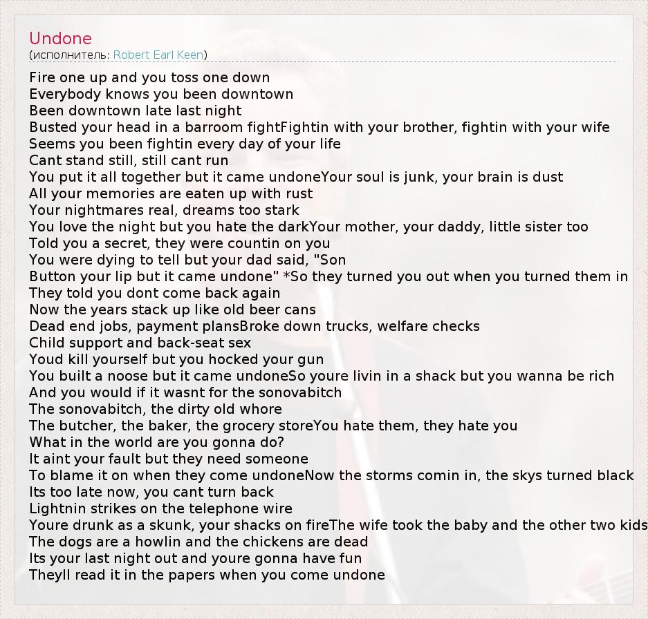 Fire one up and you toss one down Everybody knows you been downtown Been downtown late last night Busted your head in a barroom fightFightin with your brother, fightin with your wife Seems you been fightin every day of your life Cant stand still, still cant run You put it all together but it came undoneYour soul is junk, your brain is dust All your memories are eaten up with rust Your nightmares real, dreams too stark You love the night but you hate the darkYour mother, your daddy, little sister too Told you a secret, they were countin on you You were dying to tell but your dad said, "Son Button your lip but it came undone" *So they turned you out when you turned them in They told you dont come back again Now the years stack up like old beer cans Dead end jobs, payment plansBroke down trucks, welfare checks Child support and back-seat sex Youd kill yourself but you hocked your gun You built a noose but it came undoneSo youre livin in a shack but you wanna be rich And you would if it wasnt for the sonovabitch The sonovabitch, the dirty old whore The butcher, the baker, the grocery storeYou hate them, they hate you What in the world are you gonna do? It aint your fault but they need someone To blame it on when they come undoneNow the storms comin in, the skys turned black Its too late now, you cant turn back Lightnin strikes on the telephone wire Youre drunk as a skunk, your shacks on fireThe wife took the baby and the other two kids The dogs are a howlin and the chickens are dead Its your last night out and youre gonna have fun Theyll read it in the papers when you come undone