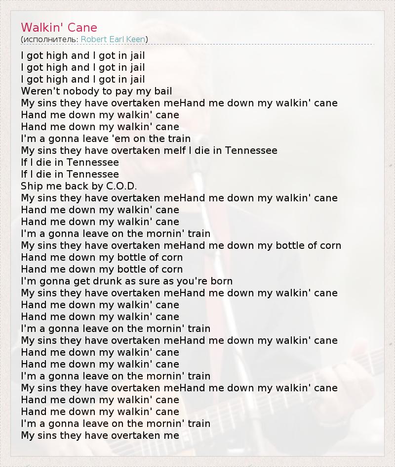 I got high and I got in jail I got high and I got in jail I got high and I got in jail Weren't nobody to pay my bail My sins they have overtaken meHand me down my walkin' cane Hand me down my walkin' cane Hand me down my walkin' cane I'm a gonna leave 'em on the train My sins they have overtaken meIf I die in Tennessee If I die in Tennessee If I die in Tennessee Ship me back by C.O.D. My sins they have overtaken meHand me down my walkin' cane Hand me down my walkin' cane Hand me down my walkin' cane I'm a gonna leave on the mornin' train My sins they have overtaken meHand me down my bottle of corn Hand me down my bottle of corn Hand me down my bottle of corn I'm gonna get drunk as sure as you're born My sins they have overtaken meHand me down my walkin' cane Hand me down my walkin' cane Hand me down my walkin' cane I'm a gonna leave on the mornin' train My sins they have overtaken meHand me down my walkin' cane Hand me down my walkin' cane Hand me down my walkin' cane I'm a gonna leave on the mornin' train My sins they have overtaken meHand me down my walkin' cane Hand me down my walkin' cane Hand me down my walkin' cane I'm a gonna leave on the mornin' train My sins they have overtaken me