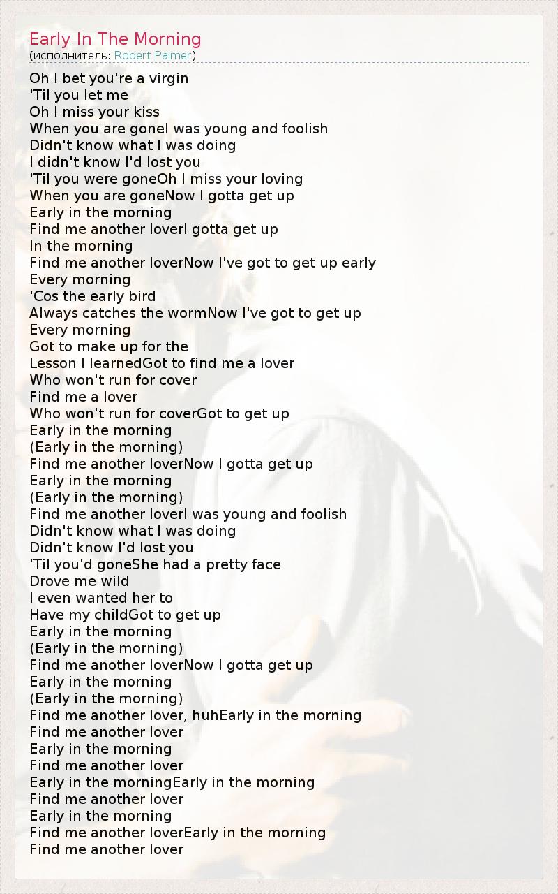 Oh I bet you're a virgin 'Til you let me Oh I miss your kiss When you are goneI was young and foolish Didn't know what I was doing I didn't know I'd lost you 'Til you were goneOh I miss your loving When you are goneNow I gotta get up Early in the morning Find me another loverI gotta get up In the morning Find me another loverNow I've got to get up early Every morning 'Cos the early bird Always catches the wormNow I've got to get up Every morning Got to make up for the Lesson I learnedGot to find me a lover Who won't run for cover Find me a lover Who won't run for coverGot to get up Early in the morning (Early in the morning) Find me another loverNow I gotta get up Early in the morning (Early in the morning) Find me another loverI was young and foolish Didn't know what I was doing Didn't know I'd lost you 'Til you'd goneShe had a pretty face Drove me wild I even wanted her to Have my childGot to get up Early in the morning (Early in the morning) Find me another loverNow I gotta get up Early in the morning (Early in the morning) Find me another lover, huhEarly in the morning Find me another lover Early in the morning Find me another lover Early in the morningEarly in the morning Find me another lover Early in the morning Find me another loverEarly in the morning Find me another lover