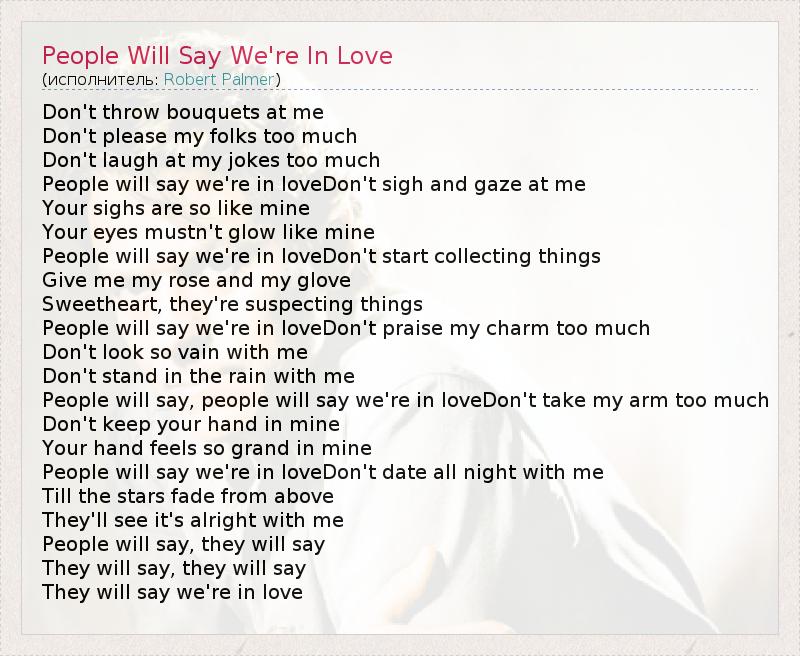 Don't throw bouquets at me Don't please my folks too much Don't laugh at my jokes too much People will say we're in loveDon't sigh and gaze at me Your sighs are so like mine Your eyes mustn't glow like mine People will say we're in loveDon't start collecting things Give me my rose and my glove Sweetheart, they're suspecting things People will say we're in loveDon't praise my charm too much Don't look so vain with me Don't stand in the rain with me People will say, people will say we're in loveDon't take my arm too much Don't keep your hand in mine Your hand feels so grand in mine People will say we're in loveDon't date all night with me Till the stars fade from above They'll see it's alright with me People will say, they will say They will say, they will say They will say we're in love