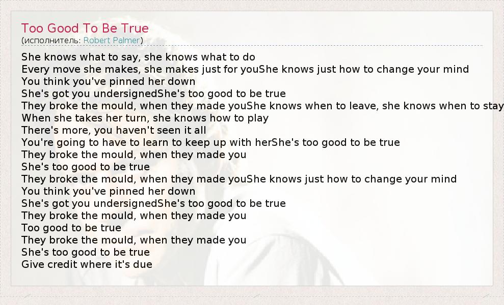 А как ты думаешь, о чем песня "Too Good To Be True" ?