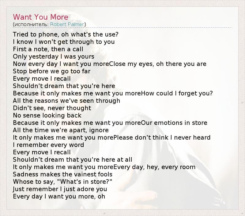 Tried to phone, oh what's the use? I know I won't get through to you First a note, then a call Only yesterday I was yours Now every day I want you moreClose my eyes, oh there you are Stop before we go too far Every move I recall Shouldn't dream that you're here Because it only makes me want you moreHow could I forget you? All the reasons we've seen through Didn't see, never thought No sense looking back Because it only makes me want you moreOur emotions in store All the time we're apart, ignore It only makes me want you morePlease don't think I never heard I remember every word Every move I recall Shouldn't dream that you're here at all It only makes me want you moreEvery day, hey, every room Sadness makes the vainest fools Whose to say, "What's in store?" Just remember I just adore you Every day I want you more, oh