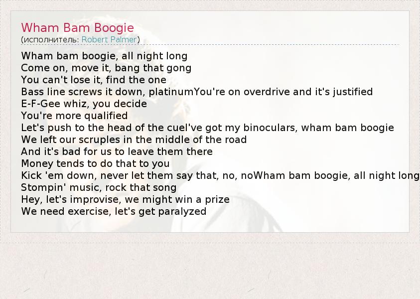 А как ты думаешь, о чем песня "Wham Bam Boogie" ?