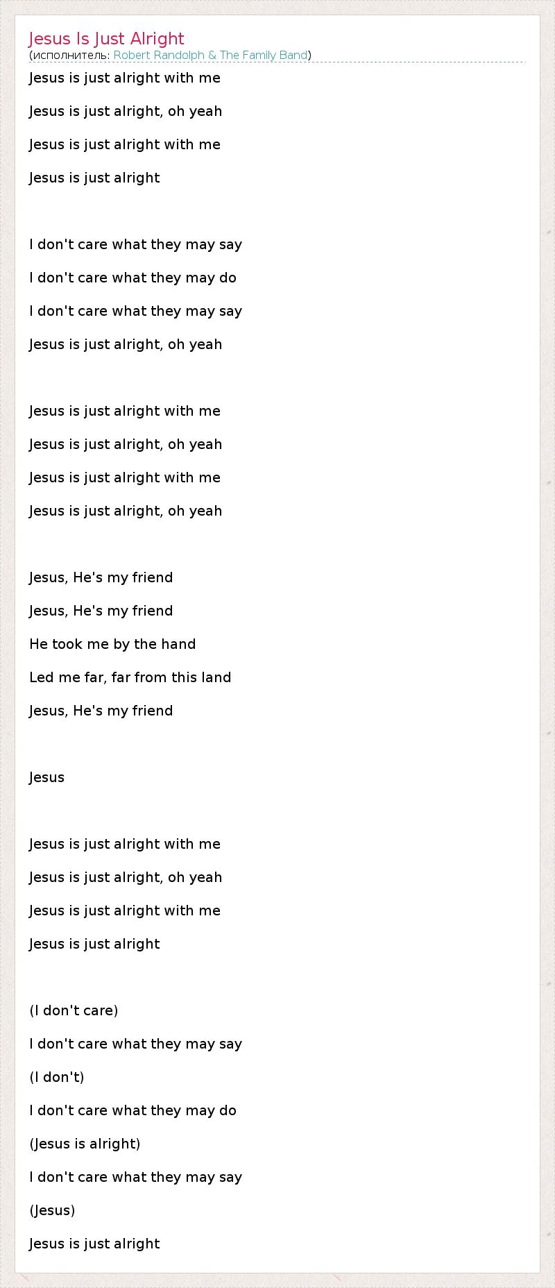 Jesus is just alright with me Jesus is just alright, oh yeah Jesus is just alright with me Jesus is just alright I don't care what they may say I don't care what they may do I don't care what they may say Jesus is just alright, oh yeah Jesus is just alright with me Jesus is just alright, oh yeah Jesus is just alright with me Jesus is just alright, oh yeah Jesus, He's my friend Jesus, He's my friend He took me by the hand Led me far, far from this land Jesus, He's my friend Jesus Jesus is just alright with me Jesus is just alright, oh yeah Jesus is just alright with me Jesus is just alright (I don't care) I don't care what they may say (I don't) I don't care what they may do (Jesus is alright) I don't care what they may say (Jesus) Jesus is just alright