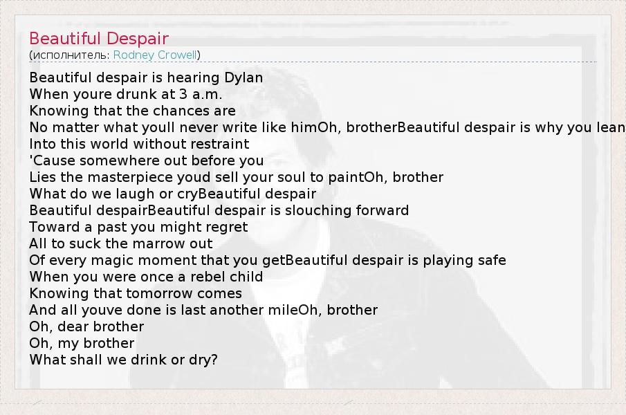 Beautiful despair is hearing Dylan When youre drunk at 3 a.m. Knowing that the chances are No matter what youll never write like himOh, brotherBeautiful despair is why you lean Into this world without restraint 'Cause somewhere out before you Lies the masterpiece youd sell your soul to paintOh, brother What do we laugh or cryBeautiful despair Beautiful despairBeautiful despair is slouching forward Toward a past you might regret All to suck the marrow out Of every magic moment that you getBeautiful despair is playing safe When you were once a rebel child Knowing that tomorrow comes And all youve done is last another mileOh, brother Oh, dear brother Oh, my brother What shall we drink or dry?