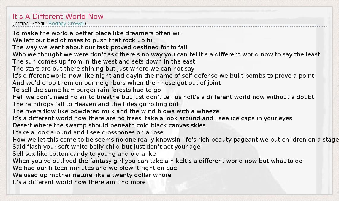 А как ты думаешь, о чем песня "It's A Different World Now" ?