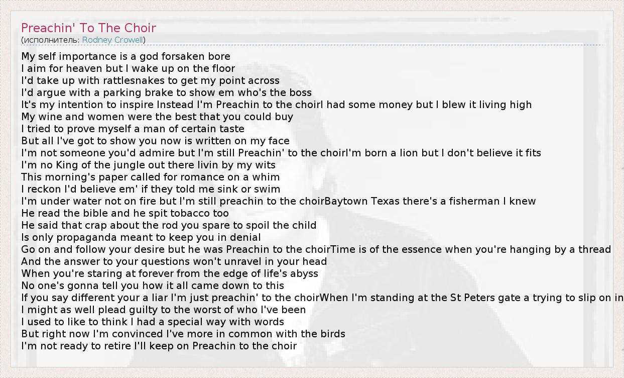 My self importance is a god forsaken bore I aim for heaven but I wake up on the floor I'd take up with rattlesnakes to get my point across I'd argue with a parking brake to show em who's the boss It's my intention to inspire Instead I'm Preachin to the choirI had some money but I blew it living high My wine and women were the best that you could buy I tried to prove myself a man of certain taste But all I've got to show you now is written on my face I'm not someone you'd admire but I'm still Preachin' to the choirI'm born a lion but I don't believe it fits I'm no King of the jungle out there livin by my wits This morning's paper called for romance on a whim I reckon I'd believe em' if they told me sink or swim I'm under water not on fire but I'm still preachin to the choirBaytown Texas there's a fisherman I knew He read the bible and he spit tobacco too He said that crap about the rod you spare to spoil the child Is only propaganda meant to keep you in denial Go on and follow your desire but he was Preachin to the choirTime is of the essence when you're hanging by a thread And the answer to your questions won't unravel in your head When you're staring at forever from the edge of life's abyss No one's gonna tell you how it all came down to this If you say different your a liar I'm just preachin' to the choirWhen I'm standing at the St Peters gate a trying to slip on in I might as well plead guilty to the worst of who I've been I used to like to think I had a special way with words But right now I'm convinced I've more in common with the birds I'm not ready to retire I'll keep on Preachin to the choir
