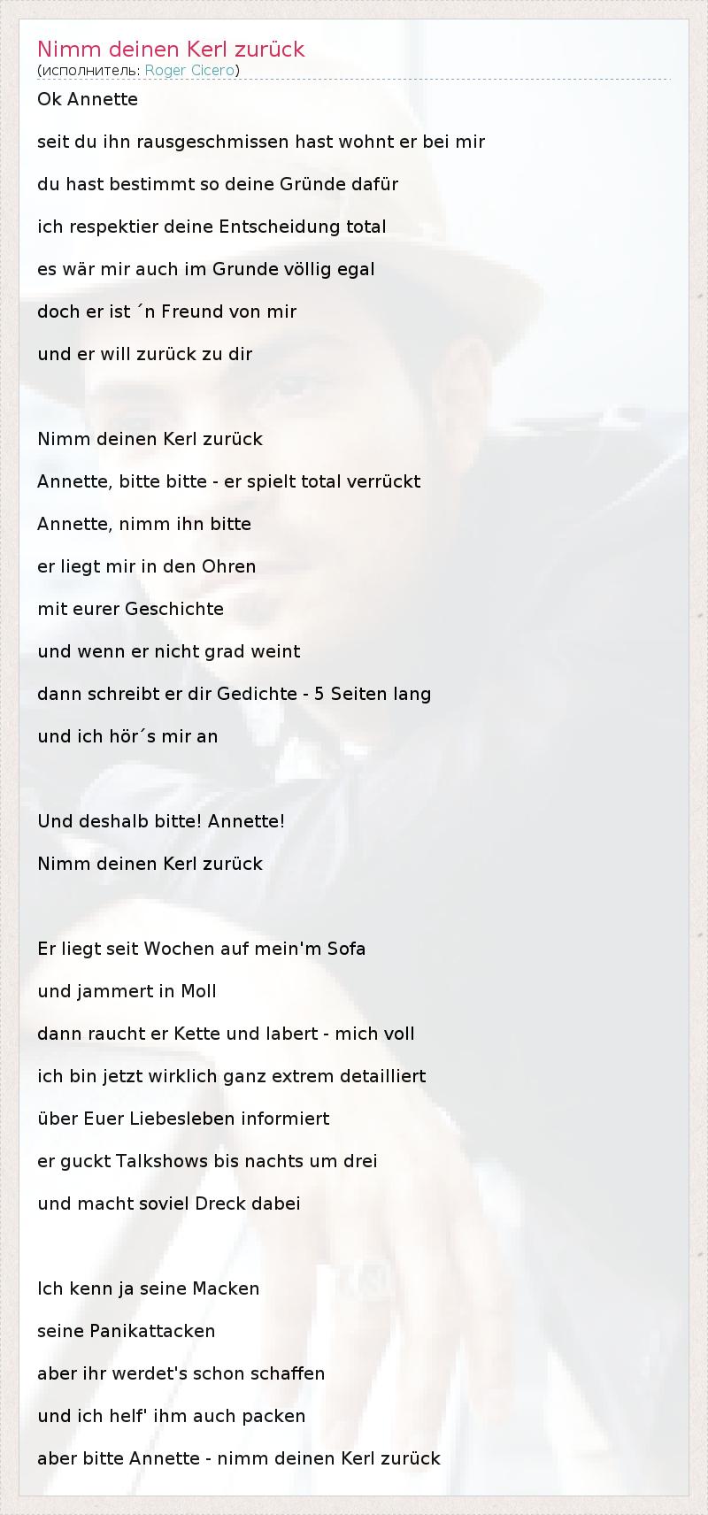 Ok Annette seit du ihn rausgeschmissen hast wohnt er bei mir du hast bestimmt so deine Gründe dafür ich respektier deine Entscheidung total es wär mir auch im Grunde völlig egal doch er ist ´n Freund von mir und er will zurück zu dir Nimm deinen Kerl zurück Annette, bitte bitte - er spielt total verrückt Annette, nimm ihn bitte er liegt mir in den Ohren mit eurer Geschichte und wenn er nicht grad weint dann schreibt er dir Gedichte - 5 Seiten lang und ich hör´s mir an Und deshalb bitte! Annette! Nimm deinen Kerl zurück Er liegt seit Wochen auf mein'm Sofa und jammert in Moll dann raucht er Kette und labert - mich voll ich bin jetzt wirklich ganz extrem detailliert über Euer Liebesleben informiert er guckt Talkshows bis nachts um drei und macht soviel Dreck dabei Ich kenn ja seine Macken seine Panikattacken aber ihr werdet's schon schaffen und ich helf' ihm auch packen aber bitte Annette - nimm deinen Kerl zurück