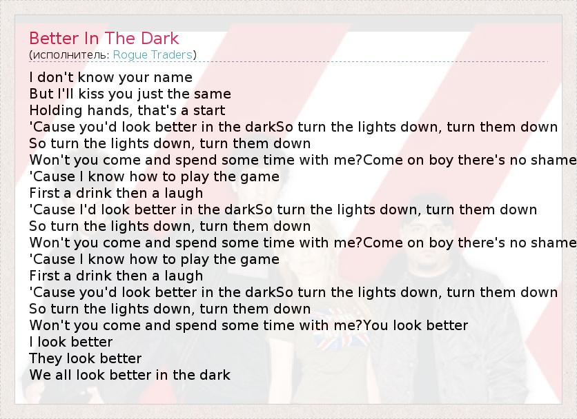 I don't know your name But I'll kiss you just the same Holding hands, that's a start 'Cause you'd look better in the darkSo turn the lights down, turn them down So turn the lights down, turn them down Won't you come and spend some time with me?Come on boy there's no shame 'Cause I know how to play the game First a drink then a laugh 'Cause I'd look better in the darkSo turn the lights down, turn them down So turn the lights down, turn them down Won't you come and spend some time with me?Come on boy there's no shame 'Cause I know how to play the game First a drink then a laugh 'Cause you'd look better in the darkSo turn the lights down, turn them down So turn the lights down, turn them down Won't you come and spend some time with me?You look better I look better They look better We all look better in the dark