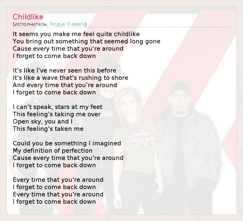 It seems you make me feel quite childlike You bring out something that seemed long gone Cause every time that you're around I forget to come back down It's like I've never seen this before It's like a wave that's rushing to shore And every time that you're around I forget to come back down I can't speak, stars at my feet This feeling's taking me over Open sky, you and I This feeling's taken me Could you be something I imagined My definition of perfection Cause every time that you're around I forget to come back down Every time that you're around I forget to come back down Every time that you're around I forget to come back down