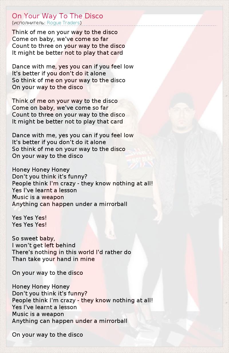 Think of me on your way to the disco Come on baby, we've come so far Count to three on your way to the disco It might be better not to play that card Dance with me, yes you can if you feel low It's better if you don't do it alone So think of me on your way to the disco On your way to the disco Think of me on your way to the disco Come on baby, we've come so far Count to three on your way to the disco It might be better not to play that card Dance with me, yes you can if you feel low It's better if you don't do it alone So think of me on your way to the disco On your way to the disco Honey Honey Honey Don't you think it's funny? People think I'm crazy - they know nothing at all! Yes I've learnt a lesson Music is a weapon Anything can happen under a mirrorball Yes Yes Yes! Yes Yes Yes! So sweet baby, I won't get left behind There's nothing in this world I'd rather do Than take your hand in mine On your way to the disco Honey Honey Honey Don't you think it's funny? People think I'm crazy - they know nothing at all! Yes I've learnt a lesson Music is a weapon Anything can happen under a mirrorball On your way to the disco