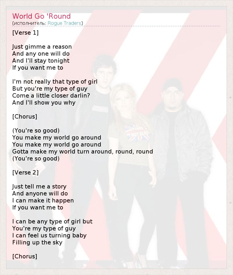 [Verse 1] Just gimme a reason And any one will do And I'll stay tonight If you want me to I'm not really that type of girl But you're my type of guy Come a little closer darlin? And I'll show you why [Chorus] (You're so good) You make my world go around You make my world go around Gotta make my world turn around, round, round (You're so good) [Verse 2] Just tell me a story And anyone will do I can make it happen If you want me to I can be any type of girl but You're my type of guy I can feel us turning baby Filling up the sky [Chorus]