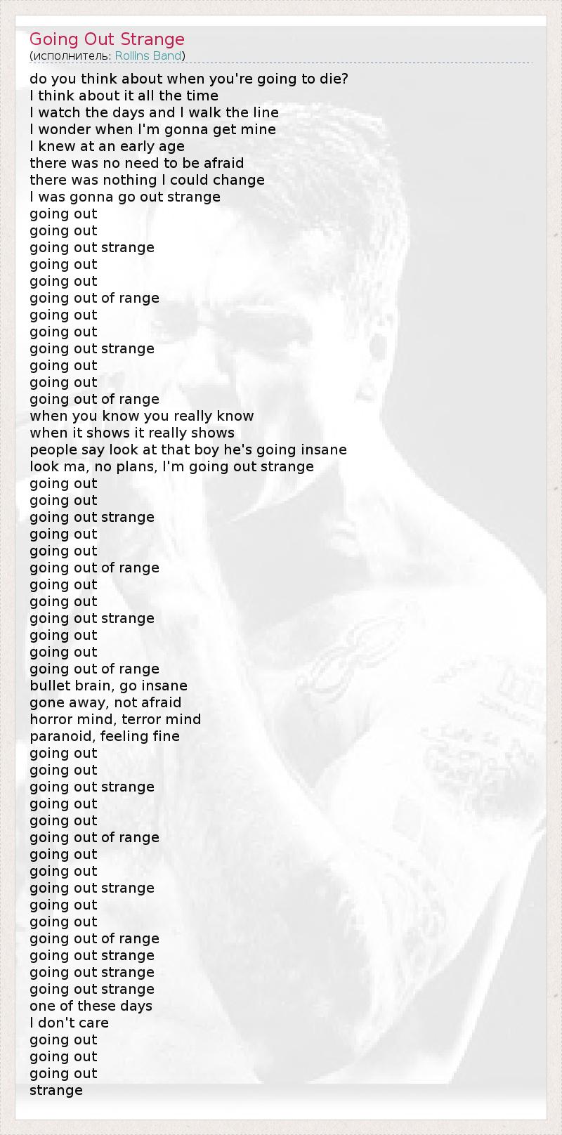 do you think about when you're going to die? I think about it all the time I watch the days and I walk the line I wonder when I'm gonna get mine I knew at an early age there was no need to be afraid there was nothing I could change I was gonna go out strange going out going out going out strange going out going out going out of range going out going out going out strange going out going out going out of range when you know you really know when it shows it really shows people say look at that boy he's going insane look ma, no plans, I'm going out strange going out going out going out strange going out going out going out of range going out going out going out strange going out going out going out of range bullet brain, go insane gone away, not afraid horror mind, terror mind paranoid, feeling fine going out going out going out strange going out going out going out of range going out going out going out strange going out going out going out of range going out strange going out strange going out strange one of these days I don't care going out going out going out strange