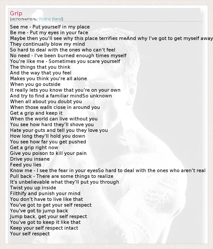 See me - Put yourself in my place Be me - Put my eyes in your face Maybe then you'll see why this place terrifies meAnd why I've got to get myself away They continually blow my mind So hard to deal with the ones who can't feel No need - I've been burned enough times myself You're like me - Sometimes you scare yourself The things that you think And the way that you feel Makes you think you're all alone When you go outside It really lets you know that you're on your own And try to find a familiar mindSo unknown When all about you doubt you When those walls close in around you Get a grip and keep it When the world can live without you You see how hard they'll shove you Hate your guts and tell you they love you How long they'll hold you down You see how far you get pushed Get a grip right now Give you poison to kill your pain Drive you insane Feed you lies Know me - I see the fear in your eyesSo hard to deal with the ones who aren't real Pull back - There are some things to realize It's unbelievable what they'll put you through Twist you up inside Filthify and punish your mind You don't have to live like that You've got to get your self respect You've got to jump back Jump back, get your self respect You've got to keep it like that Keep your self respect intact Your self respect