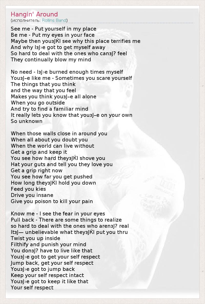 See me - Put yourself in my place Be me - Put my eyes in your face Maybe then youзЈЌl see why this place terrifies me And why IзЈ›e got to get myself away So hard to deal with the ones who canзЈ? feel They continually blow my mind No need - IзЈ›e burned enough times myself YouзЈ–e like me - Sometimes you scare yourself The things that you think and the way that you feel Makes you think youзЈ–e all alone When you go outside And try to find a familiar mind It really lets you know that youзЈ–e on your own So unknown When those walls close in around you When all about you doubt you When the world can live without Get a grip and keep it You see how hard theyзЈЌl shove you Hat your guts and tell you they love you Get a grip right now You see how far you get pushed How long theyзЈЌl hold you down Feed you kies Drive you insane Give you poison to kill your pain Know me - I see the fear in your eyes Pull back - There are some things to realize so hard to deal with the ones who arenзЈ? real ItзЈ— unbelievable what theyзЈЌl put you thru Twist you up inside Filthify and punish your mind You donзЈ? have to live like that YouзЈ›e got to get your self respect Jump back, get your self respect YouзЈ›e got to jump back Keep your self respect intact YouзЈ›e got to keep it like that Your self respect