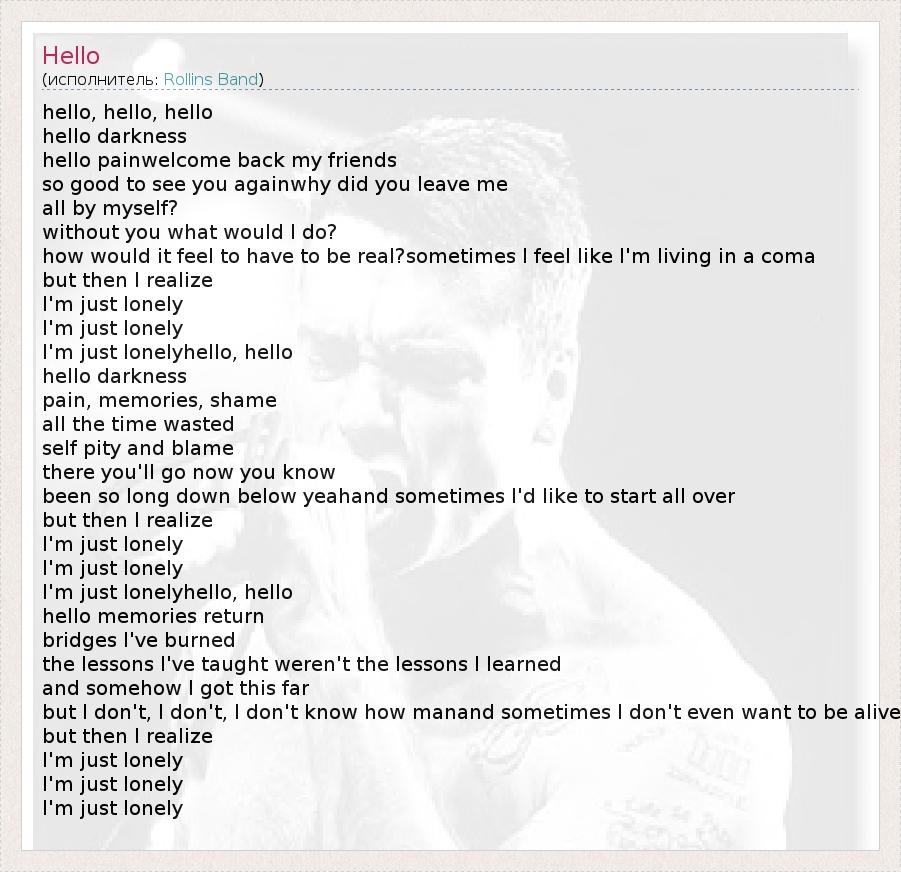 hello, hello, hello hello darkness hello painwelcome back my friends so good to see you againwhy did you leave me all by myself? without you what would I do? how would it feel to have to be real?sometimes I feel like I'm living in a coma but then I realize I'm just lonely I'm just lonely I'm just lonelyhello, hello hello darkness pain, memories, shame all the time wasted self pity and blame there you'll go now you know been so long down below yeahand sometimes I'd like to start all over but then I realize I'm just lonely I'm just lonely I'm just lonelyhello, hello hello memories return bridges I've burned the lessons I've taught weren't the lessons I learned and somehow I got this far but I don't, I don't, I don't know how manand sometimes I don't even want to be alive but then I realize I'm just lonely I'm just lonely I'm just lonely