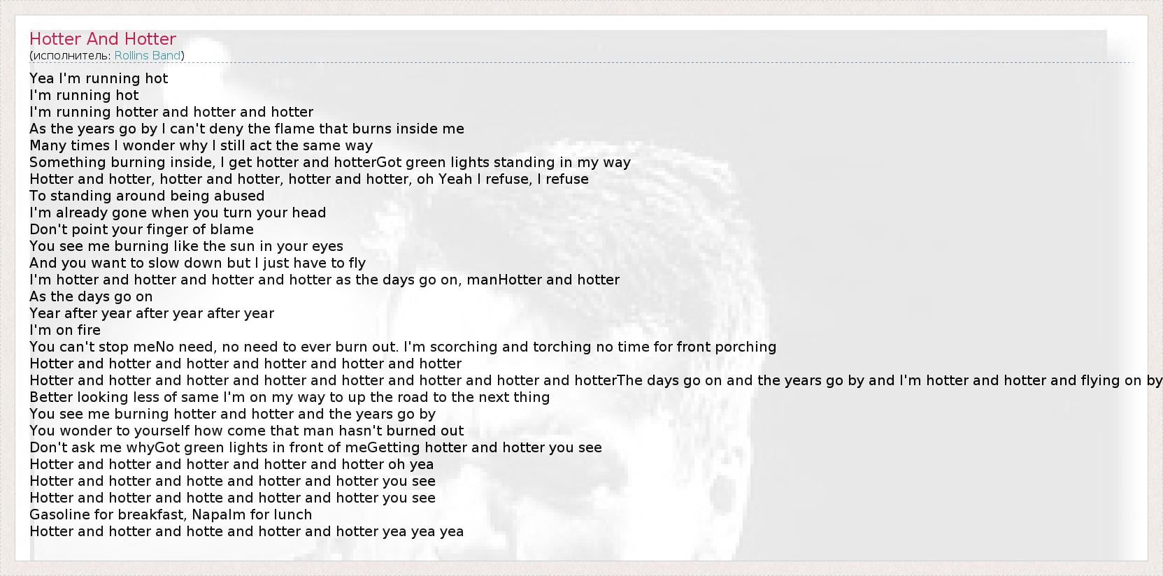 Yea I'm running hot I'm running hot I'm running hotter and hotter and hotter As the years go by I can't deny the flame that burns inside me Many times I wonder why I still act the same way Something burning inside, I get hotter and hotterGot green lights standing in my way Hotter and hotter, hotter and hotter, hotter and hotter, oh Yeah I refuse, I refuse To standing around being abused I'm already gone when you turn your head Don't point your finger of blame You see me burning like the sun in your eyes And you want to slow down but I just have to fly I'm hotter and hotter and hotter and hotter as the days go on, manHotter and hotter As the days go on Year after year after year after year I'm on fire You can't stop meNo need, no need to ever burn out. I'm scorching and torching no time for front porching Hotter and hotter and hotter and hotter and hotter and hotter Hotter and hotter and hotter and hotter and hotter and hotter and hotter and hotterThe days go on and the years go by and I'm hotter and hotter and flying on by Better looking less of same I'm on my way to up the road to the next thing You see me burning hotter and hotter and the years go by You wonder to yourself how come that man hasn't burned out Don't ask me whyGot green lights in front of meGetting hotter and hotter you see Hotter and hotter and hotter and hotter and hotter oh yea Hotter and hotter and hotte and hotter and hotter you see Hotter and hotter and hotte and hotter and hotter you see Gasoline for breakfast, Napalm for lunch Hotter and hotter and hotte and hotter and hotter yea yea yea