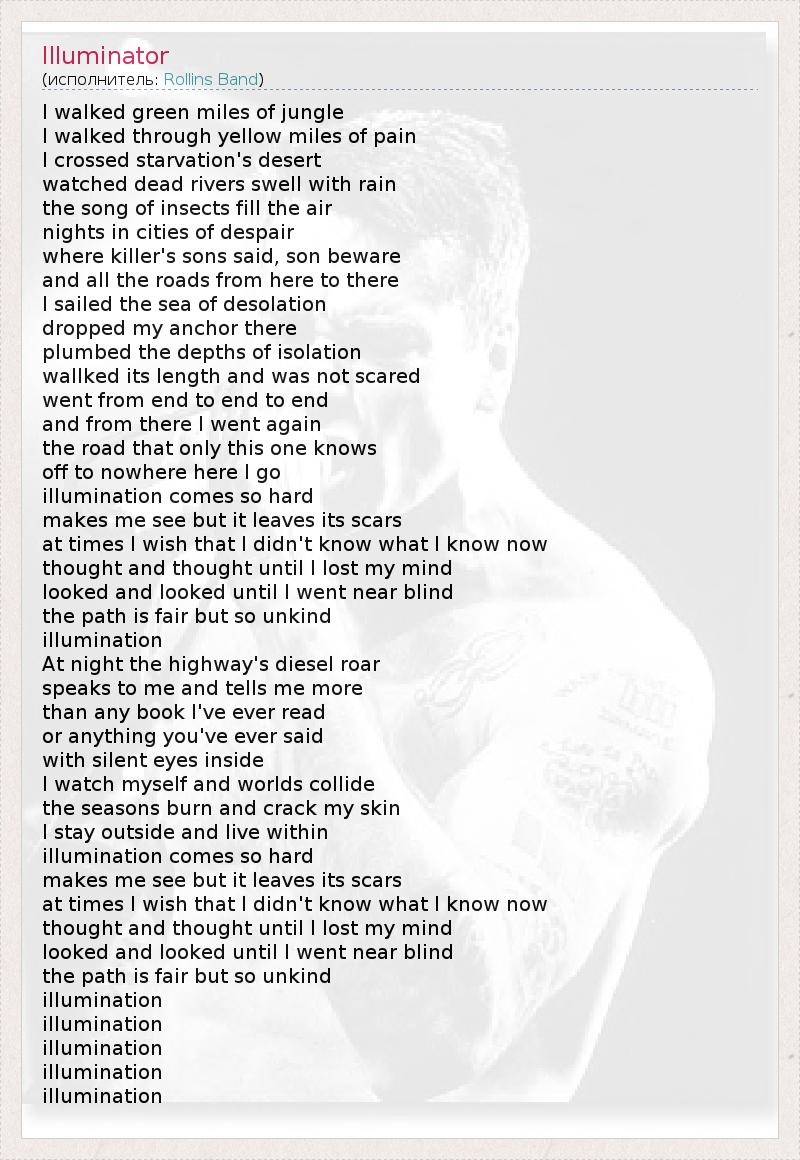I walked green miles of jungle I walked through yellow miles of pain I crossed starvation's desert watched dead rivers swell with rain the song of insects fill the air nights in cities of despair where killer's sons said, son beware and all the roads from here to there I sailed the sea of desolation dropped my anchor there plumbed the depths of isolation wallked its length and was not scared went from end to end to end and from there I went again the road that only this one knows off to nowhere here I go illumination comes so hard makes me see but it leaves its scars at times I wish that I didn't know what I know now thought and thought until I lost my mind looked and looked until I went near blind the path is fair but so unkind illumination At night the highway's diesel roar speaks to me and tells me more than any book I've ever read or anything you've ever said with silent eyes inside I watch myself and worlds collide the seasons burn and crack my skin I stay outside and live within illumination comes so hard makes me see but it leaves its scars at times I wish that I didn't know what I know now thought and thought until I lost my mind looked and looked until I went near blind the path is fair but so unkind illumination illumination illumination illumination illumination