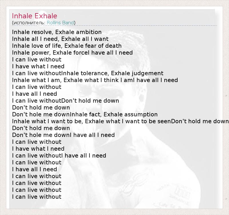 Inhale resolve, Exhale ambition Inhale all I need, Exhale all I want Inhale love of life, Exhale fear of death Inhale power, Exhale forceI have all I need I can live without I have what I need I can live withoutInhale tolerance, Exhale judgement Inhale what I am, Exhale what I think I amI have all I need I can live without I have all I need I can live withoutDon't hold me down Don't hold me down Don't hole me downInhale fact, Exhale assumption Inhale what I want to be, Exhale what I want to be seenDon't hold me down Don't hold me down Don't hole me downI have all I need I can live without I have what I need I can live withoutI have all I need I can live without I have all I need I can live without I can live without I can live without I can live without