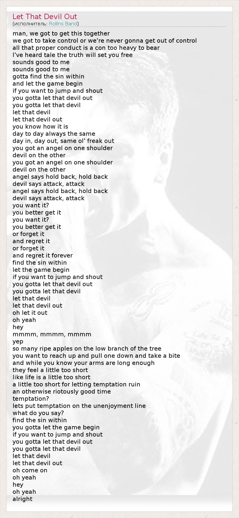 man, we got to get this together we got to take control or we're never gonna get out of control all that proper conduct is a con too heavy to bear I've heard tale the truth will set you free sounds good to me sounds good to me gotta find the sin within and let the game begin if you want to jump and shout you gotta let that devil out you gotta let that devil let that devil let that devil out you know how it is day to day always the same day in, day out, same ol' freak out you got an angel on one shoulder devil on the other you got an angel on one shoulder devil on the other angel says hold back, hold back devil says attack, attack angel says hold back, hold back devil says attack, attack you want it? you better get it you want it? you better get it or forget it and regret it or forget it and regret it forever find the sin within let the game begin if you want to jump and shout you gotta let that devil out you gotta let that devil let that devil let that devil out oh let it out oh yeah hey mmmm, mmmm, mmmm yep so many ripe apples on the low branch of the tree you want to reach up and pull one down and take a bite and while you know your arms are long enough they feel a little too short like life is a little too short a little too short for letting temptation ruin an otherwise riotously good time temptation? lets put temptation on the unenjoyment line what do you say? find the sin within you gotta let the game begin if you want to jump and shout you gotta let that devil out you gotta let that devil let that devil let that devil out oh come on oh yeah hey oh yeah alright