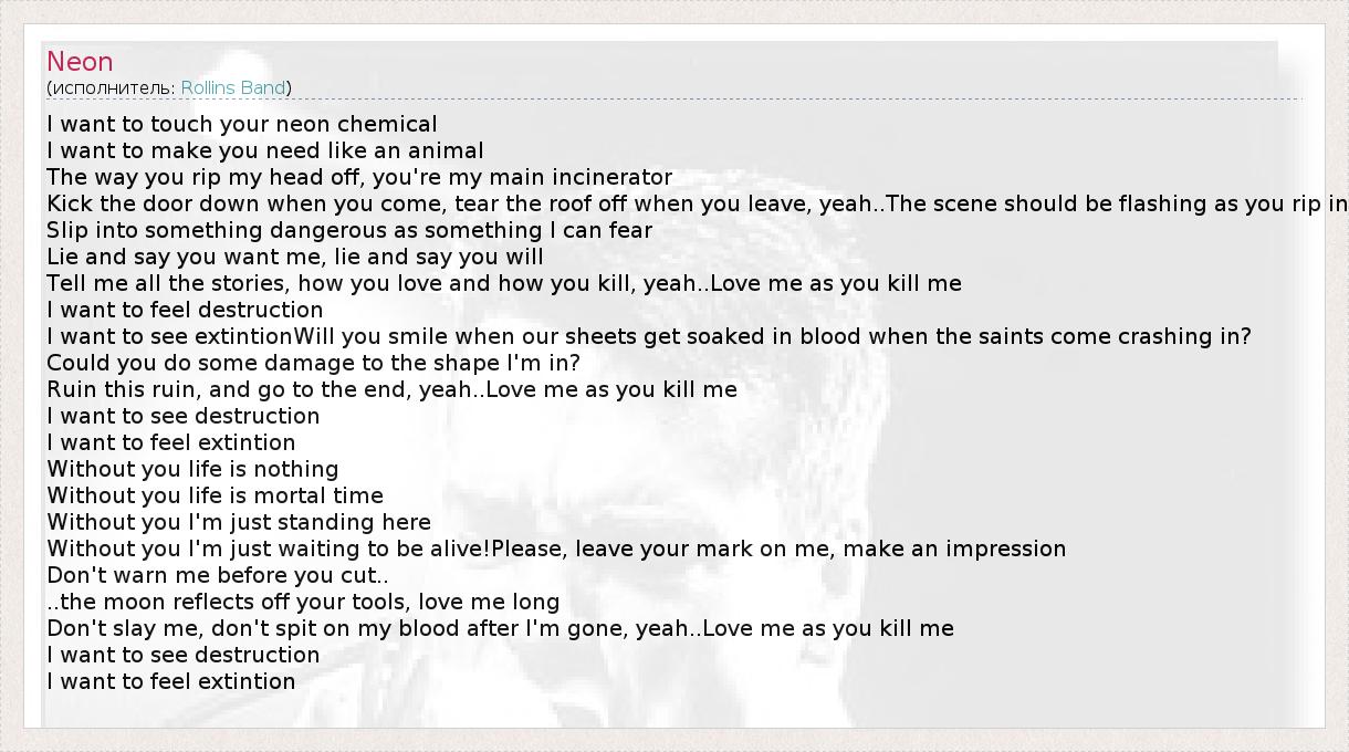 I want to touch your neon chemical I want to make you need like an animal The way you rip my head off, you're my main incinerator Kick the door down when you come, tear the roof off when you leave, yeah..The scene should be flashing as you rip in Slip into something dangerous as something I can fear Lie and say you want me, lie and say you will Tell me all the stories, how you love and how you kill, yeah..Love me as you kill me I want to feel destruction I want to see extintionWill you smile when our sheets get soaked in blood when the saints come crashing in? Could you do some damage to the shape I'm in? Ruin this ruin, and go to the end, yeah..Love me as you kill me I want to see destruction I want to feel extintion Without you life is nothing Without you life is mortal time Without you I'm just standing here Without you I'm just waiting to be alive!Please, leave your mark on me, make an impression Don't warn me before you cut.. ..the moon reflects off your tools, love me long Don't slay me, don't spit on my blood after I'm gone, yeah..Love me as you kill me I want to see destruction I want to feel extintion