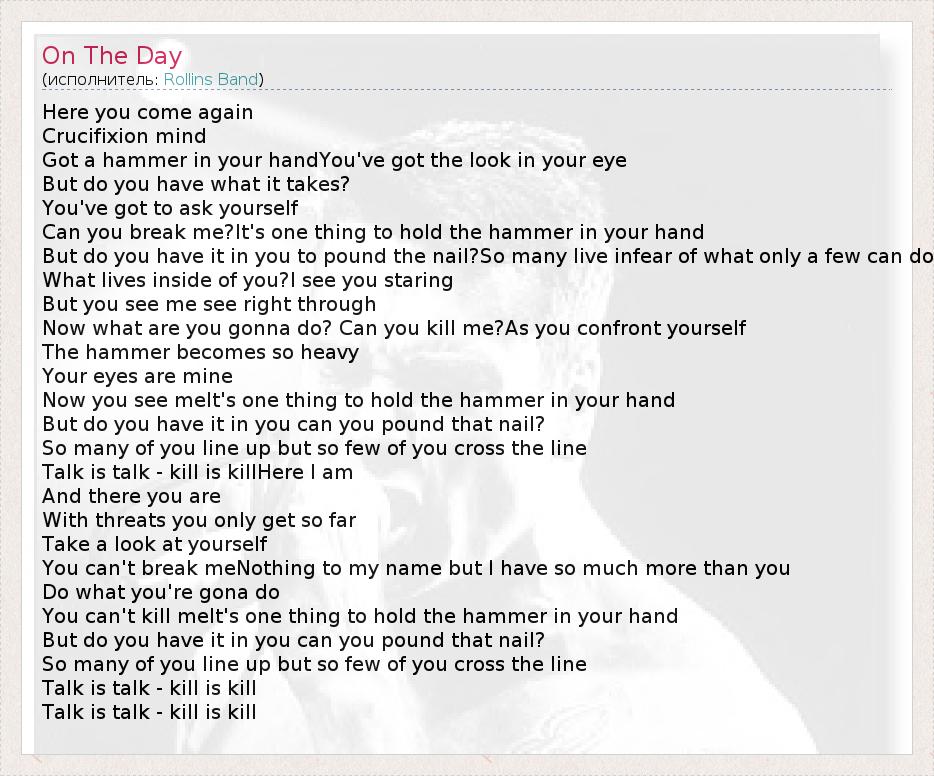 Here you come again Crucifixion mind Got a hammer in your handYou've got the look in your eye But do you have what it takes? You've got to ask yourself Can you break me?It's one thing to hold the hammer in your hand But do you have it in you to pound the nail?So many live infear of what only a few can do What lives inside of you?I see you staring But you see me see right through Now what are you gonna do? Can you kill me?As you confront yourself The hammer becomes so heavy Your eyes are mine Now you see meIt's one thing to hold the hammer in your hand But do you have it in you can you pound that nail? So many of you line up but so few of you cross the line Talk is talk - kill is killHere I am And there you are With threats you only get so far Take a look at yourself You can't break meNothing to my name but I have so much more than you Do what you're gona do You can't kill meIt's one thing to hold the hammer in your hand But do you have it in you can you pound that nail? So many of you line up but so few of you cross the line Talk is talk - kill is kill Talk is talk - kill is kill