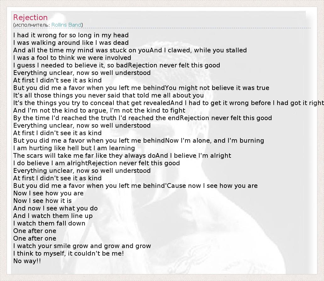 I had it wrong for so long in my head I was walking around like I was dead And all the time my mind was stuck on youAnd I clawed, while you stalled I was a fool to think we were involved I guess I needed to believe it, so badRejection never felt this good Everything unclear, now so well understood At first I didn't see it as kind But you did me a favor when you left me behindYou might not believe it was true It's all those things you never said that told me all about you It's the things you try to conceal that get revealedAnd I had to get it wrong before I had got it right And I'm not the kind to argue, I'm not the kind to fight By the time I'd reached the truth I'd reached the endRejection never felt this good Everything unclear, now so well understood At first I didn't see it as kind But you did me a favor when you left me behindNow I'm alone, and I'm burning I am hurting like hell but I am learning The scars will take me far like they always doAnd I believe I'm alright I do believe I am alrightRejection never felt this good Everything unclear, now so well understood At first I didn't see it as kind But you did me a favor when you left me behind'Cause now I see how you are Now I see how you are Now I see how it is And now I see what you do And I watch them line up I watch them fall down One after one One after one I watch your smile grow and grow and grow I think to myself, it couldn't be me! No way!!