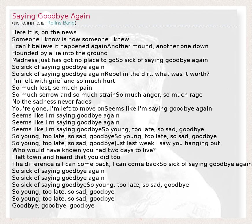 Here it is, on the news Someone I know is now someone I knew I can't believe it happened againAnother mound, another one down Hounded by a lie into the ground Madness just has got no place to goSo sick of saying goodbye again So sick of saying goodbye again So sick of saying goodbye againRebel in the dirt, what was it worth? I'm left with grief and so much hurt So much lost, so much pain So much sorrow and so much strainSo much anger, so much rage No the sadness never fades You're gone, I'm left to move onSeems like I'm saying goodbye again Seems like I'm saying goodbye again Seems like I'm saying goodbye again Seems like I'm saying goodbyeSo young, too late, so sad, goodbye So young, too late, so sad, goodbyeSo young, too late, so sad, goodbye So young, too late, so sad, goodbyeJust last week I saw you hanging out Who would have known you had two days to live? I left town and heard that you did too The difference is I can come back, I can come backSo sick of saying goodbye again So sick of saying goodbye again So sick of saying goodbye again So sick of saying goodbyeSo young, too late, so sad, goodbye So young, too late, so sad, goodbye So young, too late, so sad, goodbye Goodbye, goodbye, goodbye