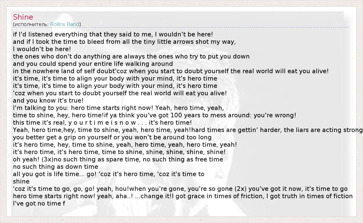 if I'd listened everything that they said to me, I wouldn't be here! and if I took the time to bleed from all the tiny little arrows shot my way, I wouldn't be here! the ones who don't do anything are always the ones who try to put you down and you could spend your entire life walking around in the nowhere land of self doubt'coz when you start to doubt yourself the real world will eat you alive! it's time, it's time to align your body with your mind, it's hero time it's time, it's time to align your body with your mind, it's hero time 'coz when you start to doubt yourself the real world will eat you alive! and you know it's true! I'm talking to you: hero time starts right now! Yeah, hero time, yeah, time to shine, hey, hero time!if ya think you've got 100 years to mess around: you're wrong! this time it's real, y o u r t i m e i s n o w . . . it's hero time! Yeah, hero time,hey, time to shine, yeah, hero time, yeah!hard times are gettin' harder, the liars are acting strong you better get a grip on yourself or you won't be around too long it's hero time, hey, time to shine, yeah, hero time, yeah, hero time, yeah! it's hero time, it's hero time, time to shine, shine, shine, shine, shine! oh yeah! (3x)no such thing as spare time, no such thing as free time no such thing as down time all you got is life time... go! 'coz it's hero time, 'coz it's time to shine 'coz it's time to go, go, go! yeah, hou!when you're gone, you're so gone (2x) you've got it now, it's time to go hero time starts right now! yeah, aha..! ...change it!I got grace in times of friction, I got truth in times of fiction I've got no time f