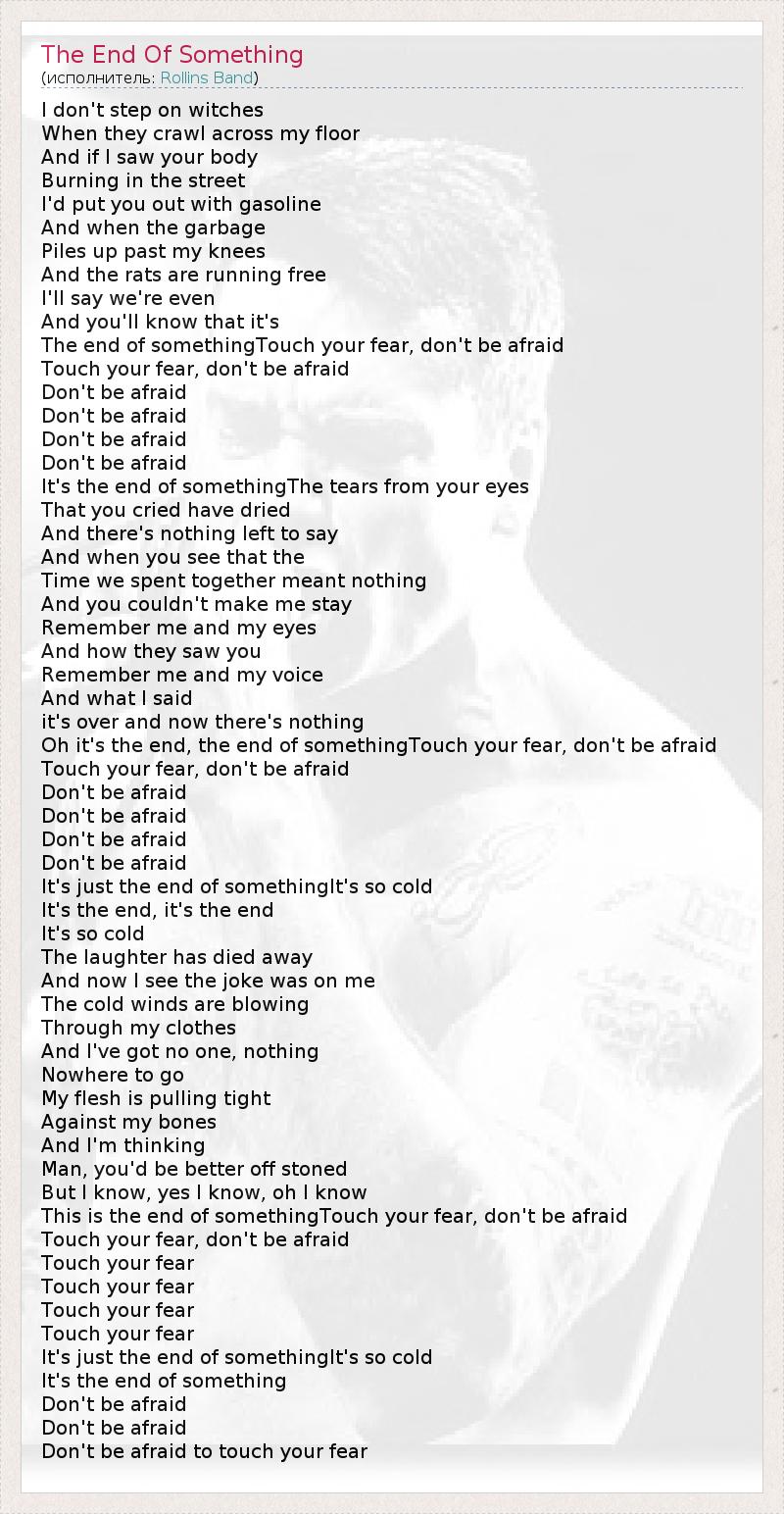 I don't step on witches When they crawl across my floor And if I saw your body Burning in the street I'd put you out with gasoline And when the garbage Piles up past my knees And the rats are running free I'll say we're even And you'll know that it's The end of somethingTouch your fear, don't be afraid Touch your fear, don't be afraid Don't be afraid Don't be afraid Don't be afraid Don't be afraid It's the end of somethingThe tears from your eyes That you cried have dried And there's nothing left to say And when you see that the Time we spent together meant nothing And you couldn't make me stay Remember me and my eyes And how they saw you Remember me and my voice And what I said it's over and now there's nothing Oh it's the end, the end of somethingTouch your fear, don't be afraid Touch your fear, don't be afraid Don't be afraid Don't be afraid Don't be afraid Don't be afraid It's just the end of somethingIt's so cold It's the end, it's the end It's so cold The laughter has died away And now I see the joke was on me The cold winds are blowing Through my clothes And I've got no one, nothing Nowhere to go My flesh is pulling tight Against my bones And I'm thinking Man, you'd be better off stoned But I know, yes I know, oh I know This is the end of somethingTouch your fear, don't be afraid Touch your fear, don't be afraid Touch your fear Touch your fear Touch your fear Touch your fear It's just the end of somethingIt's so cold It's the end of something Don't be afraid Don't be afraid Don't be afraid to touch your fear